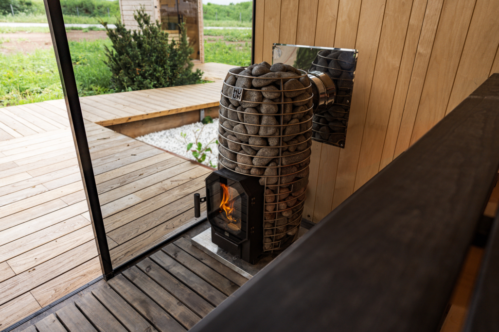 Its innovative design ensures that 75% of the heat from the firewood directly heats your sauna rather than escaping through the chimney. The large volume of stones retains heat, providing steam for over 30 minutes after the fire is extinguished.