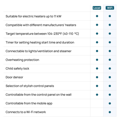You can also connect the sauna lighting, ventilation, and steamer to the control system for added convenience. Overheating protection and a child lock take care of the safety of your sauna.